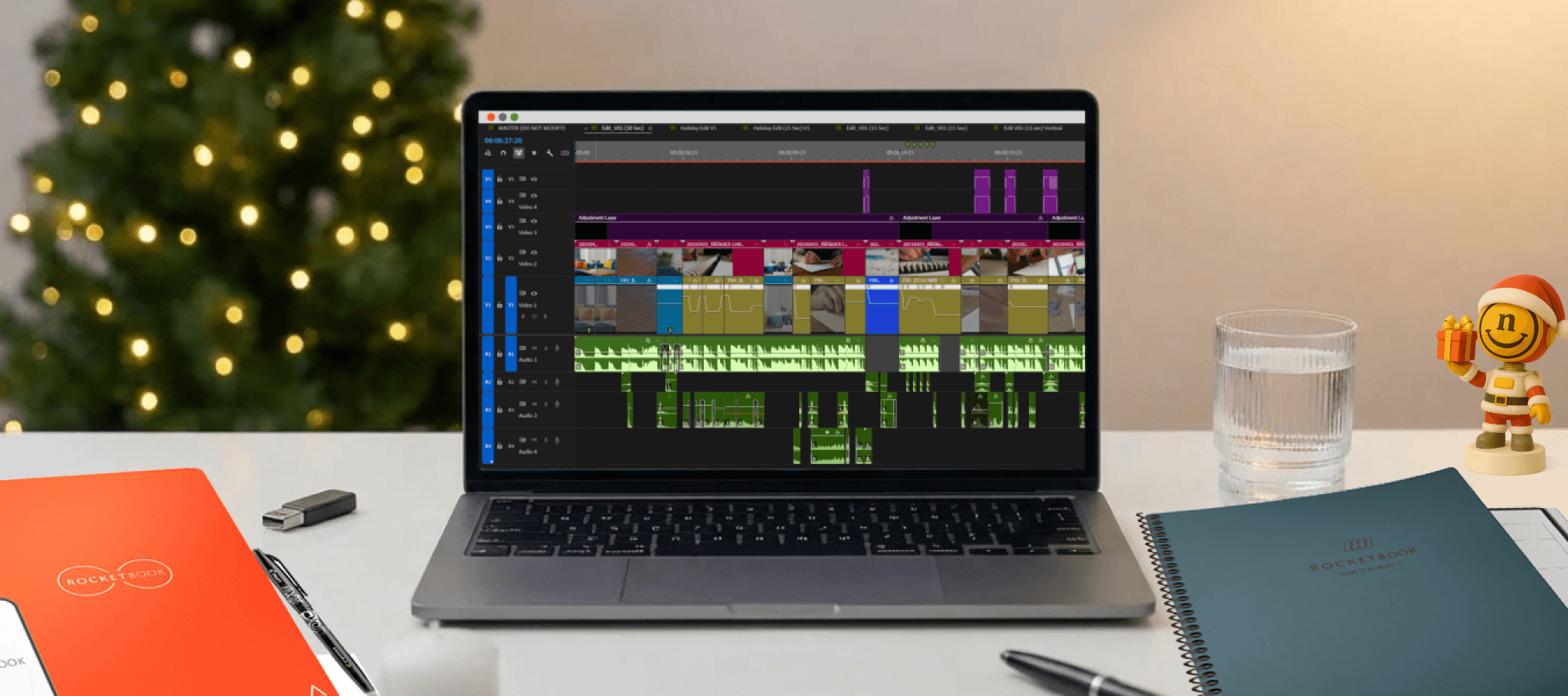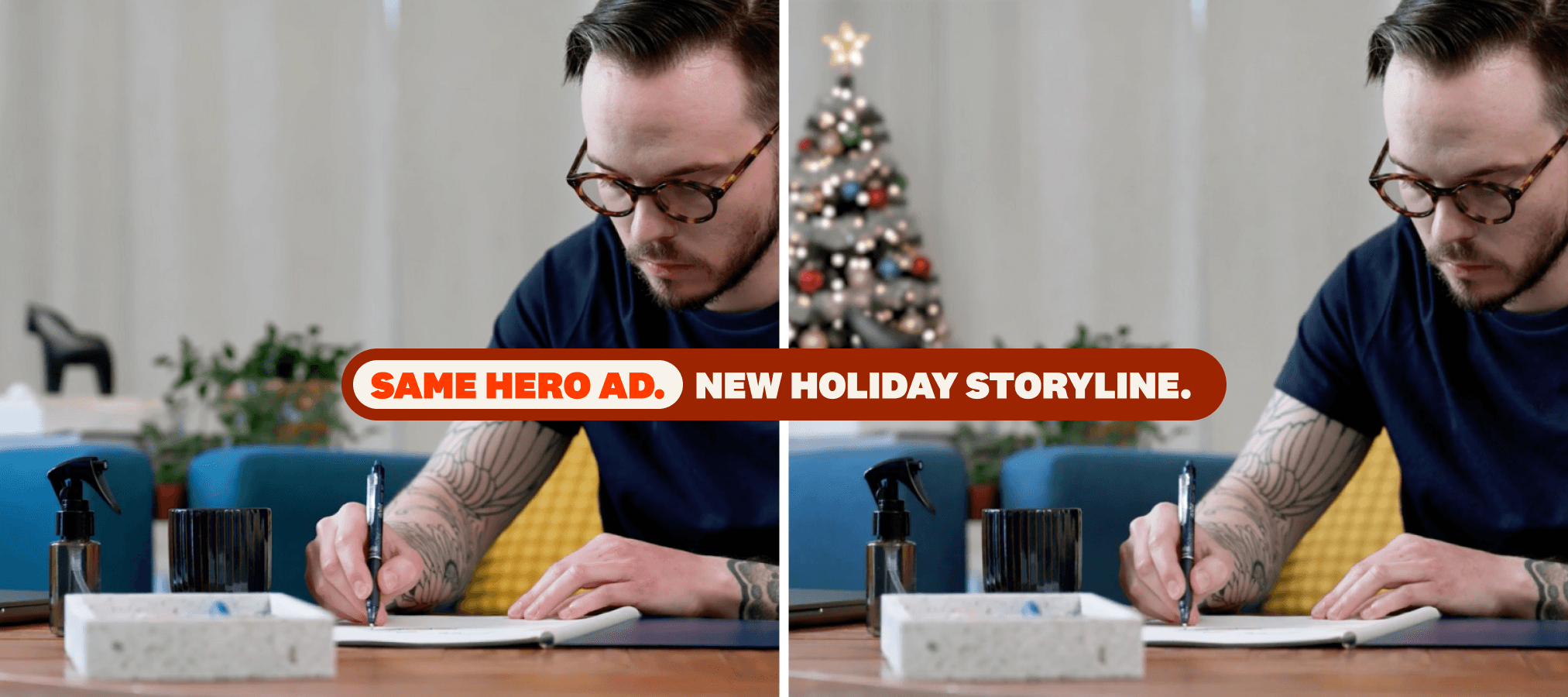 The Rocketbook spot had several desk and workspace shots that could host décor without distracting from the product. A Christmas tree became the anchor for the entire holiday treatment.