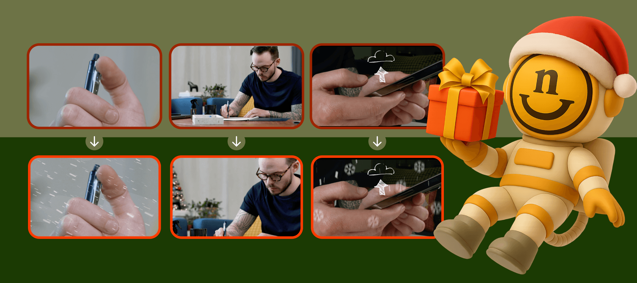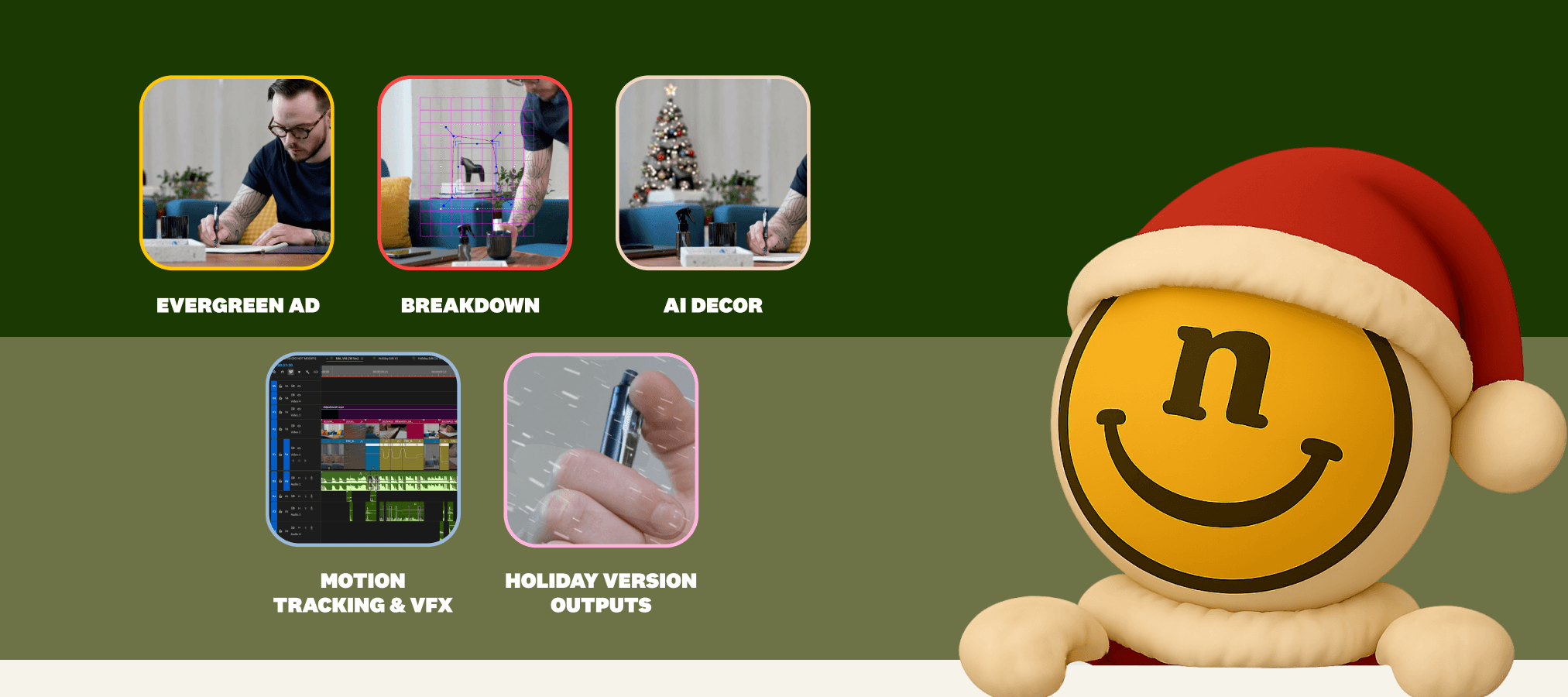 Holiday creative doesn’t have to be recycled. Neato’s video team starts with your best-performing ads, then uses AI tools (like Google’s NanoBanana in Photoshop), motion tracking, and VFX in After Effects to layer in holiday elements—trees, snow, sound design—all built in post for a fast, on-brand Q4 refresh.