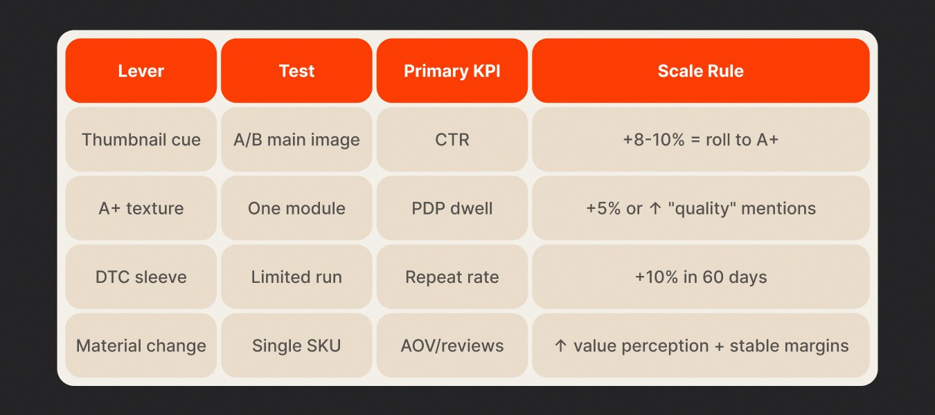 Test This Week: Retro sleeve for top DTC SKU; collect UGC and use it in A+.
