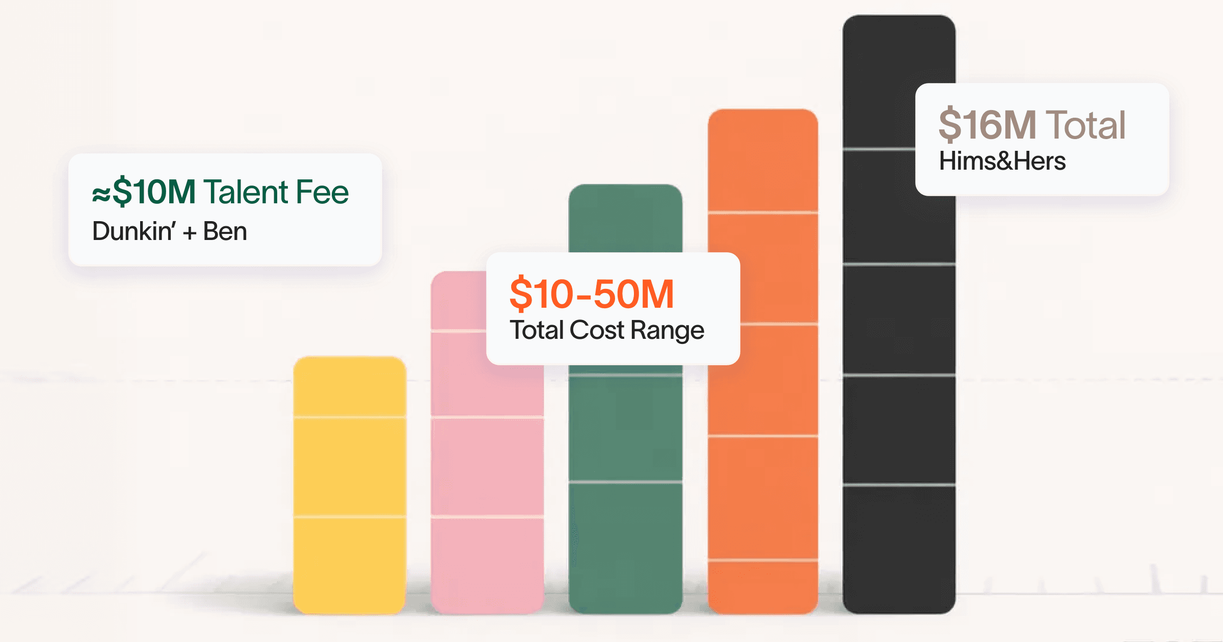 Some brands spend far more. When Dunkin' enlisted Ben Affleck for their 2023 Super Bowl campaign, the celebrity fee alone was approximately $10 million, according to CNN, citing three sources with knowledge of the deal. Affleck also helped conceive the creative and directed through his production company, Artists Equity. When Hims & Hers disclosed their 2026 Super Bowl investment to Inc. magazine, the number was $16 million for a single ad, nearly a year of production effort, produced in-house with a voiceover by Common.
