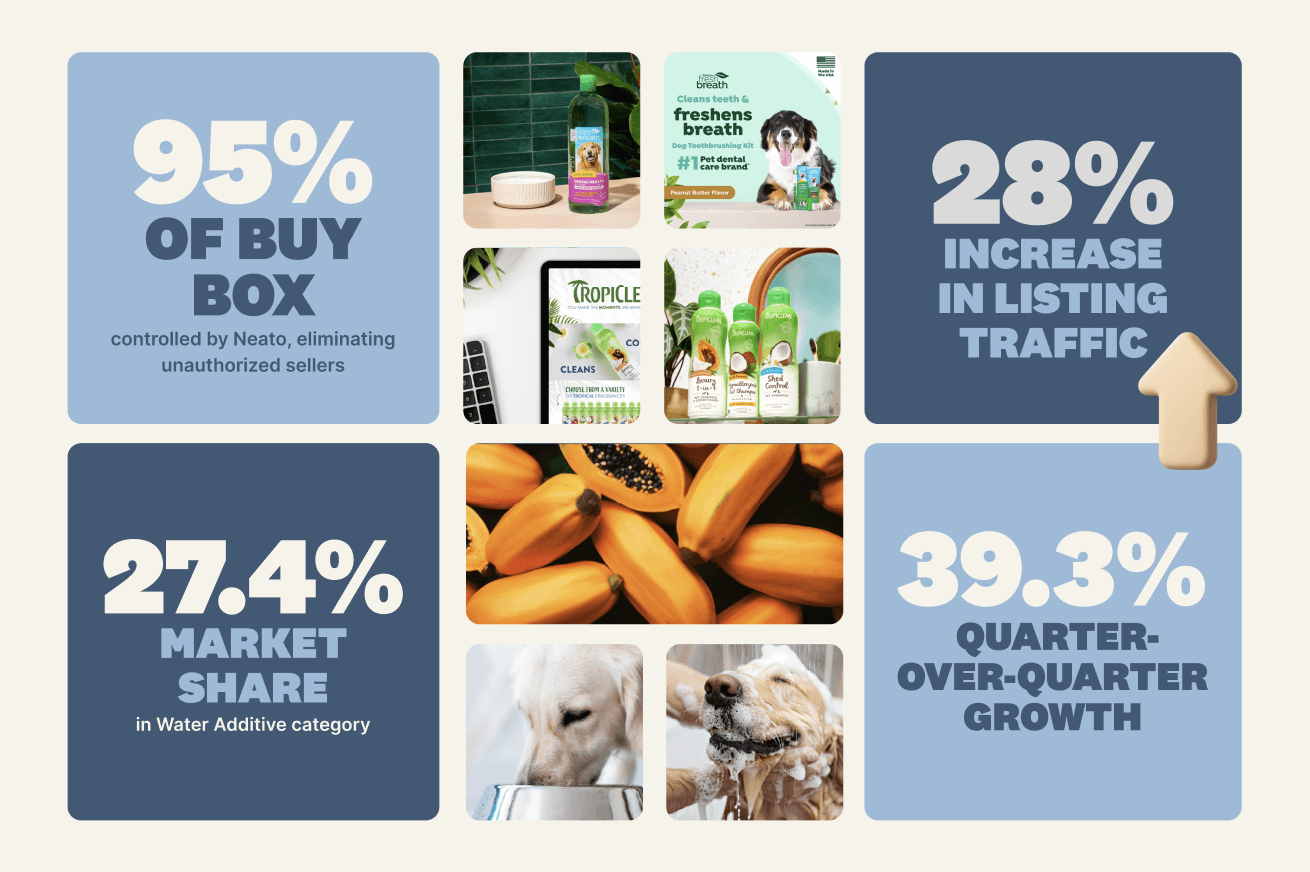 Despite their success in brick-and-mortar retail, Tropiclean needed to enhance their digital shelf presence to match their physical success. To address this, they partnered with Neato to leverage their strengths in product innovation and brand reputation while harnessing Neato’s expertise in navigating Amazon's complexities. The primary goal was to reclaim market control and achieve sustainable growth.