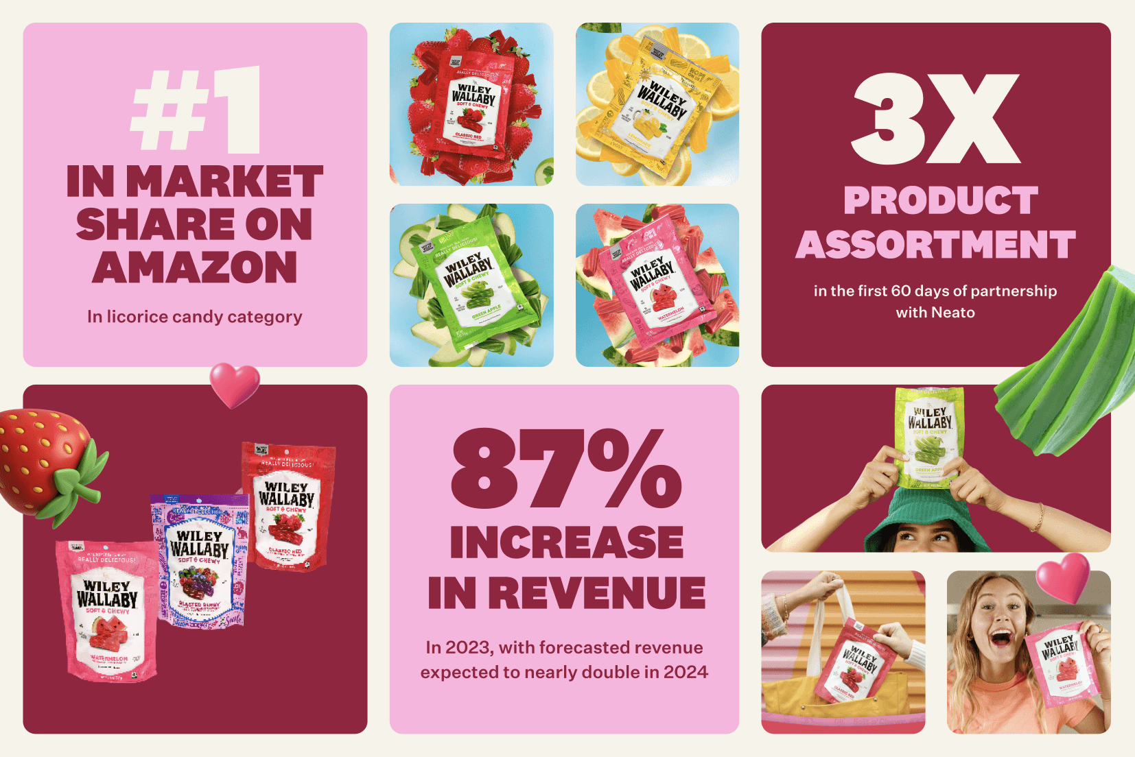 Market Leadership: Wiley Wallaby has ascended to the #1 market share position for licorice candy on Amazon, capturing 17.8% of the market share, surpassing well-known brands like Twizzlers (17%) and Red Vines (7.2%).Expanded Product Assortment: Prior to the partnership, Wiley Wallaby had only 10 products listed on Amazon. Within the first 60 days of working with Neato, their product assortment more than tripled, adding 36 new items, including 25 multipacks and bundle options. Today, Wiley Wallaby boasts 90 items in their assortment, with 57 of those as multipacks and bundles.Revenue Growth: In 2023, Wiley Wallaby’s revenue on Amazon soared by 87% year-over-year. Neato projects continued growth, with forecasted revenue expected to nearly double from the previous year. This substantial increase underscores the effectiveness of the strategic partnership, highlighting significant improvements in product assortment, operational efficiency, and market positioning.